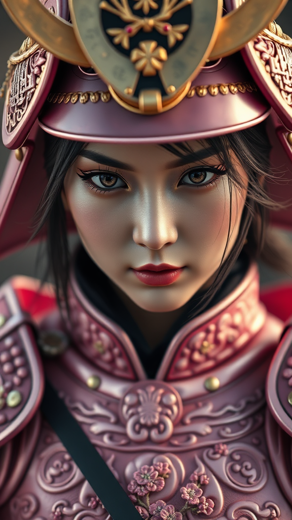 A stunning 3D render captures a woman adorned in intricate pink samurai armor, the close-up shot revealing every exquisite detail of her protective gear. Her armor gleams with a soft metallic sheen, intricately engraved with delicate cherry blossom motifs that contrast with the robust structure. Her focused eyes exude strength and determination, framed by wisps of hair escaping from under a traditional kabuto helmet. Highlights of gold and silver add an air of regal elegance, while the soft lighting accentuates the raw, powerful essence of her presence. The background is a subtle blur, emphasizing her poised and commanding figure, embodying the perfect blend of grace and formidable warrior spirit.