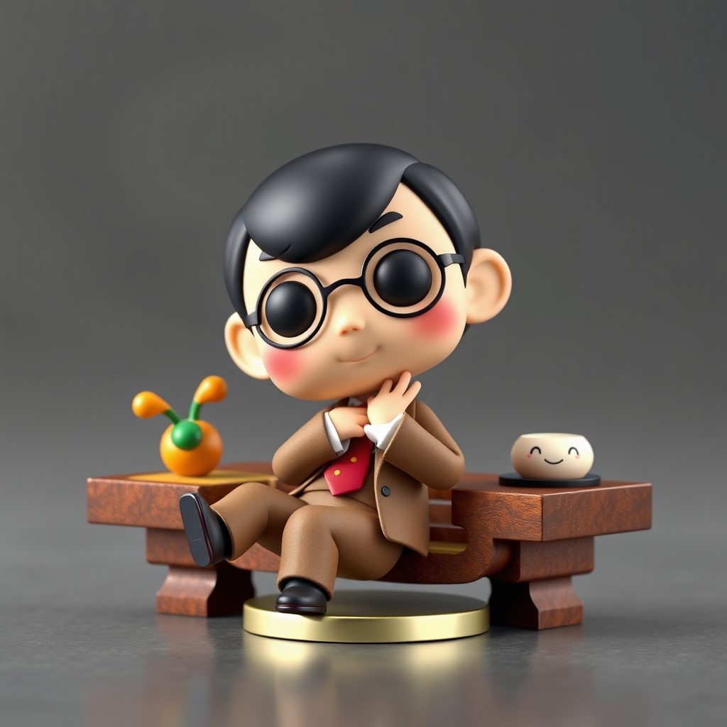 A stunning 3D render featuring a Nendoroid-style art toy, inspired by a Japanese mascot. This secret collectible figurine resembles the whimsical Mr. Bean character in relaxed poses. Crafted with the enchanting design flair of Studio Ghibli, the figure exudes a shiny, mesmerizing mood, capturing the playful essence and intricate beauty of the original concept.