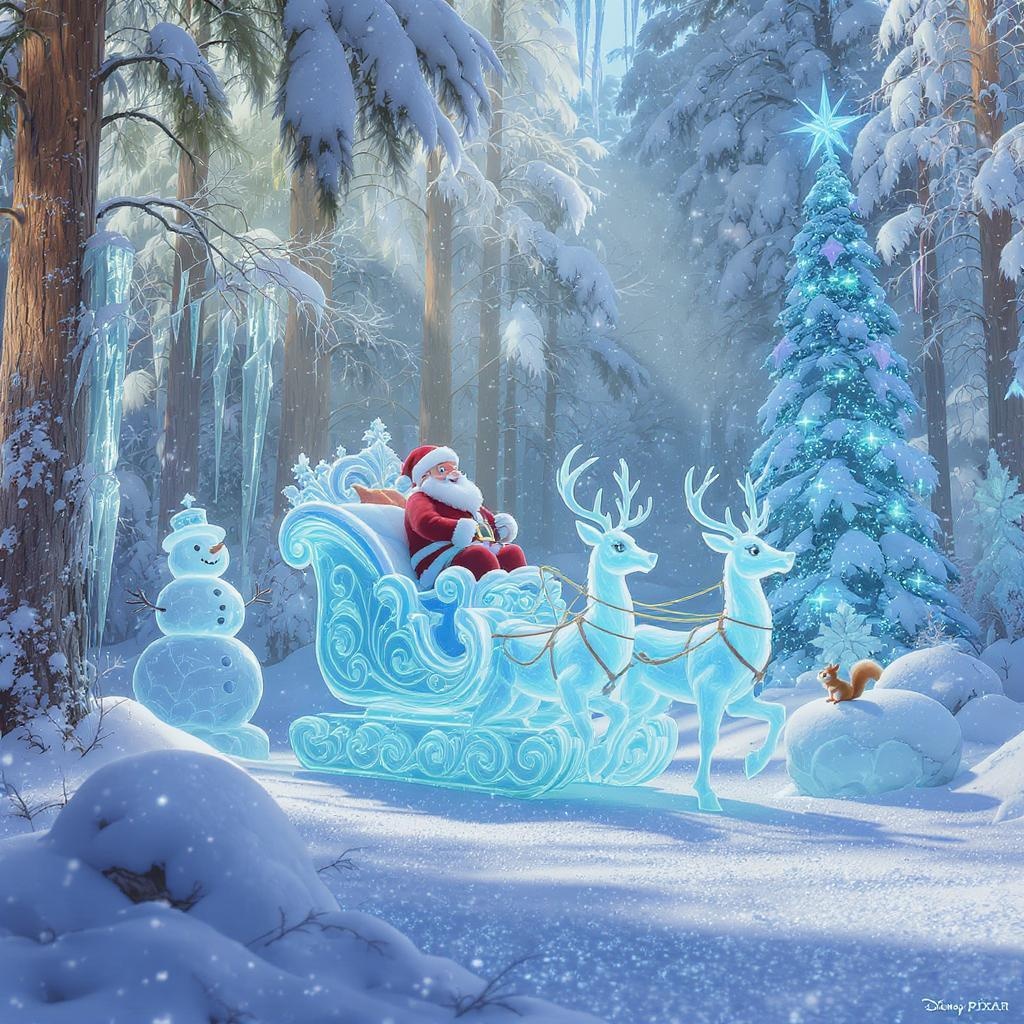 A stunning 3D render in Disney Pixar style depicting a photorealistic snowy forest composed entirely of ice. Enchanting ice sculptures illustrate a fairytale scene with Santa aboard an intricately carved ice sleigh, pulled by majestic ice deer, and accompanied by a whimsical ice snowman. A curious squirrel perches on an ornately detailed Christmas tree made of shimmering ice. Each ice figure boasts complex details and perfect shapes, contributing to a breathtaking visual spectacle. The scene captures the illusion of movement, creating a dynamic ambience. Light dances across the pristine snow, casting delightful shadows from the sculptures onto the glittering ground. The atmosphere is peaceful and magical, offering a mystical and idyllic setting perfect for a holiday wonderland, where everything is artistically crafted from ice.
