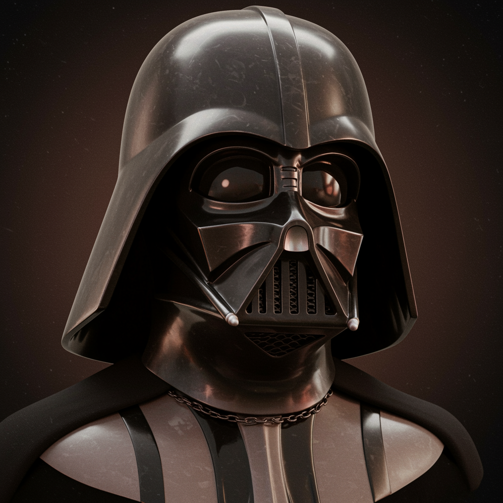 A stunning 3D render of a beautifully detailed Darth Vader, captured in a 150 mm frame with exquisite studio soft lighting and subtle rim lighting that accentuates vibrant details. This hyperrealistic portrayal of the iconic Star Wars character showcases anatomical precision and elegance against a captivating background. Rendered using octane for the finest 8k quality and mastery, the illustration stands as a delicate and finely detailed CG creation. Designed as an incredible wallpaper that combines unity and artistry, this masterpiece evokes an amazing sense of immersion and realism. With absurd levels of detail and creativity, this 3D piece explores the depths of absurdness and artistic expression, blending the sepia tones of painting with the dynamic energy of cartoons and sketch art. Despite playful nods to lower resolution elements and abstract qualities, the overall composition remains a high-quality artistic venture, reminiscent of analog photography and classical illustration, all wrapped within a single, compelling face.