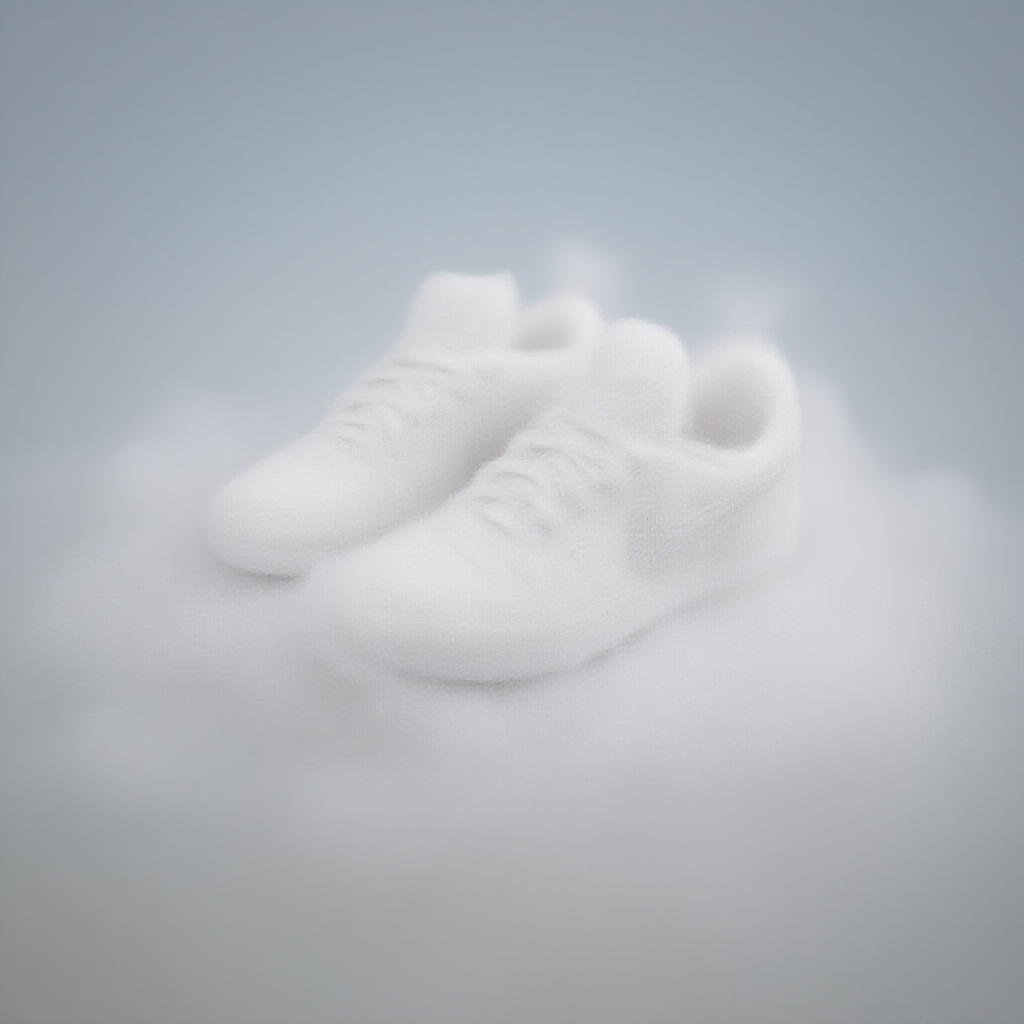 A stunning 3D render of a pair of shoes crafted from cotton candy, resting gracefully on a fluffy cloud, featuring the iconic Nike logo; this clean composition is a beautiful artwork illustration with a dreamy, whimsical touch, inspired by the imaginative style of Midjourney Nfixer.