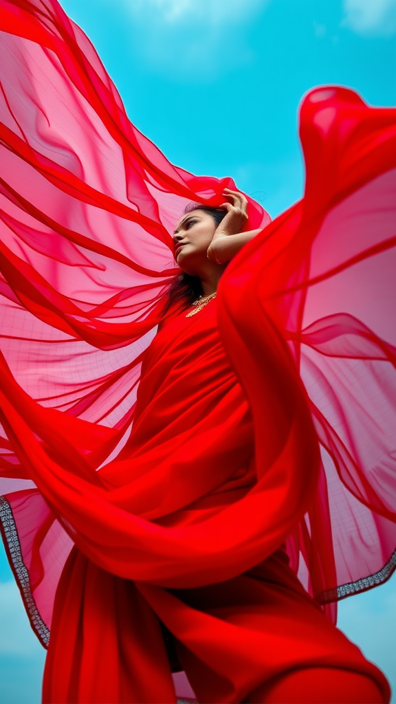 A stunning 45-year-old Indian woman gracefully dons a vibrant, flowing red Saree, the fabric swirling and cascading around her in a spectacular display. Captured from a low vantage point, the photograph presents an awe-inspiring bug's-eye view, accentuating the Saree's dynamic movement. The shot, taken from the ground up, offers an extreme upward angle, highlighting the elegance of her pose and capturing her serene, confident expression. The side view emphasizes the intricate details of the traditional attire, as billowing layers create a mesmerizing, almost ethereal aura around her. Her head is captured within the frame, enhancing the dramatic and visually striking composition.