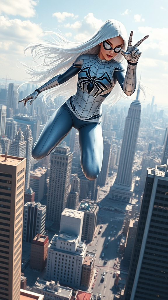 A stunning 4K painting captures a scene in ultra-high definition, presenting a highly realistic and detailed portrayal of a superheroine perched atop the city skyline. Dressed in a Spider-Man inspired costume, the protagonist showcases her strength and agility as she leaps gracefully from one building to another. Her flowing, long white hair cascades behind her, adding to the dynamic energy of the moment. The setting is a bustling metropolis under a bright sky, emphasizing a white superhero theme. The heroine, appearing to be around 25 years old, is depicted in her entirety, illustrating an empowering and awe-inspiring image of heroism. Throughout the scene, spider motifs subtly accentuate her superhero qualities.