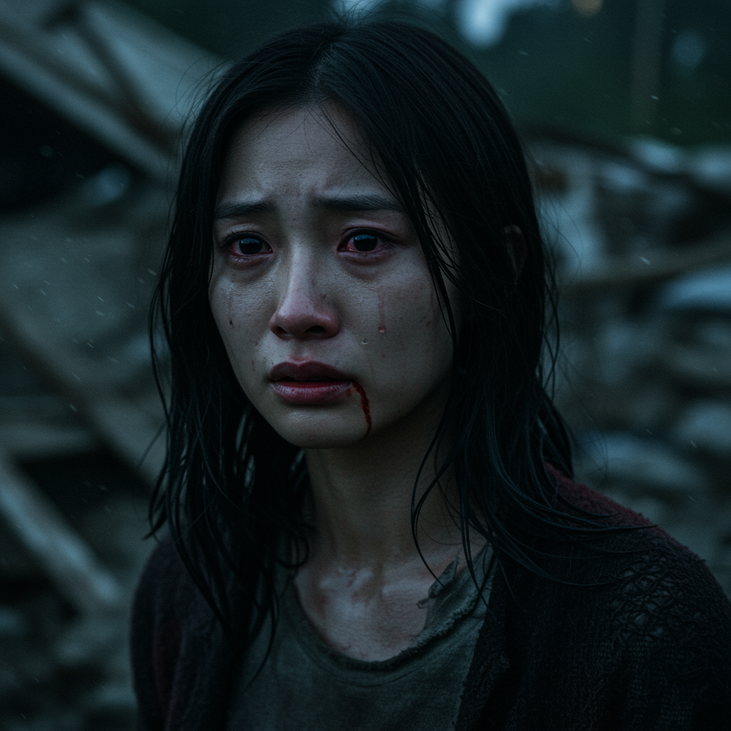 A stunning 4K portrait of an Asian woman standing amidst the ruins of her past, her expression a haunting mix of grief and determination. Her eyes, filled with unshed tears, reflect the dim light of a setting sun, highlighting the intricate details of her anguish. A small cut on her lip trickles blood, a stark contrast against her pale skin. The dark scene envelops her, with shadows creating a tapestry of despair and muted colors washing over her like a somber veil. Her clothes are tattered, remnants of a life once whole, now lost. The delicate textures of her weathered surroundings tell a story of collapse and resilience. Amidst this chaos, she stands alone, the image capturing the raw horror and the quiet strength needed to forge a new path forward.