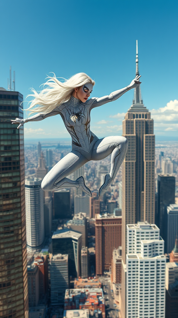 A stunning 4K ultra-high definition painting captures the dynamic, full-body display of a superheroine’s strength and agility. The scene is set at the pinnacle of a bustling cityscape where the heroine, a 25-year-old with flowing white hair, leaps gracefully between two towering buildings. She wears a striking, form-fitting costume inspired by Spider-Man, adorned with intricate web patterns. The figure exudes power and poise, her movements evoking the fluidity and grace of a spider in motion. The carefully detailed painting immerses viewers in a white superhero theme, highlighting the protagonist’s awe-inspiring athleticism and charisma against the backdrop of a vibrant city under a clear, blue sky.