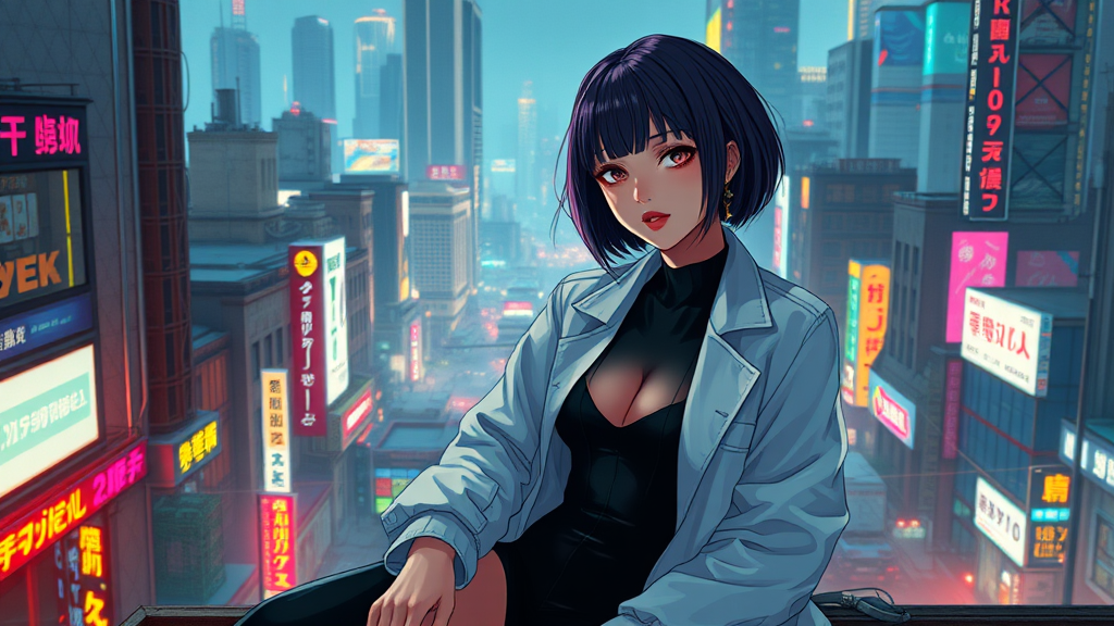 A stunning 8k cyberpunk portrait of a solo girl sitting elegantly, surrounded by a vivid and chaotic cityscape. She embodies a beautiful and aesthetic masterpiece with glowing skin and the most elegant form of chaos, set against a brutalist architecture backdrop. Her style exudes a romanticism in vivid colors, dressed in a sleek black bodysuit with a contrasting white jacket. Her short hair frames her face, accentuating her captivating red lips. The scene captures her in a wide shot, positioned thoughtfully far from the lens, encapsulating an official Cyberpunk 2077 anime style, reimagined with ultra-detailed and dynamic elements.