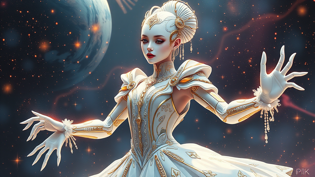 A stunning 8k digital painting of an exquisite galactic ballerina blending elements of clowncore and cyberpunk, featuring a futuristic Russian cyborg college student. Her pristine, shimmering white attire showcases intricate and decadent design with a mesmerizing golden ratio, capturing the essence of both sci-fi and fantasy worlds. This highly detailed illustration, inspired by renowned artists like Artgerm, Loish, and WLOP, evokes the enchanting style of Ever After High. Rendered with octane-level quality, the artwork boasts smooth, sharp focus and is suitable for display on platforms like ArtStation, embodying the vibrant and imaginative spirit of concept art.