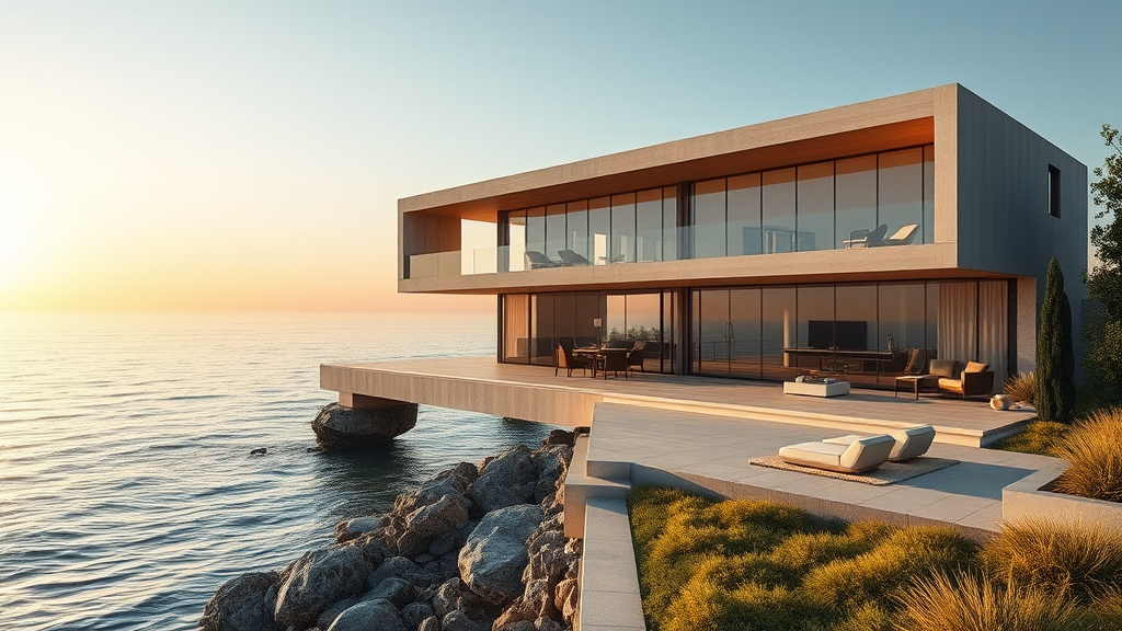 A stunning 8K hyper realistic image of a beautiful 21st century modern house with sleek concrete edges and expansive glass walls, perched gracefully by the calm, wide sea at golden hour. The sun casts a warm, golden glow, highlighting the seamless blend of architecture with nature. Gentle waves reflect the soft hues of the sky, adding serenity to the scene. Lush, minimalist landscaping surrounds the house, and a chic outdoor patio with contemporary furniture extends toward the horizon, inviting relaxation and contemplation in this tranquil coastal paradise.