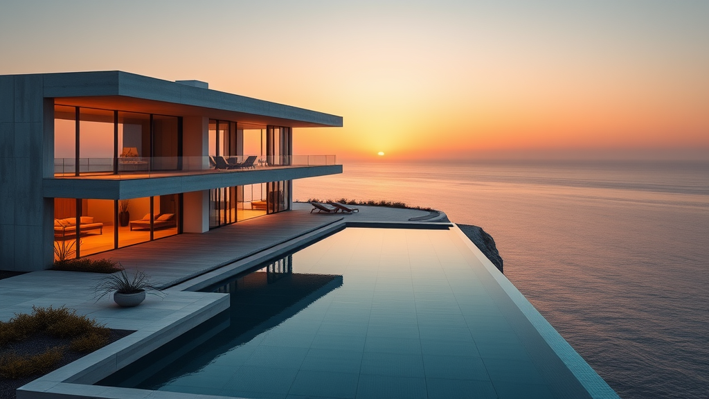 A stunning 8K hyper-realistic image of a breathtaking house by the serene sea, featuring sleek concrete edges and expansive walls made mostly of glass in a contemporary 21st-century design. The house is illuminated by the warm hues of the golden hour, casting a soft, dreamy glow over the scene. The wide, calm sea reflects the colors of the sunset, adding a sense of tranquility and harmony. The house's structure is complemented by subtle artistic features like an elegant, minimalist garden with sculptural plants and a stylish infinity pool that seamlessly merges with the horizon.