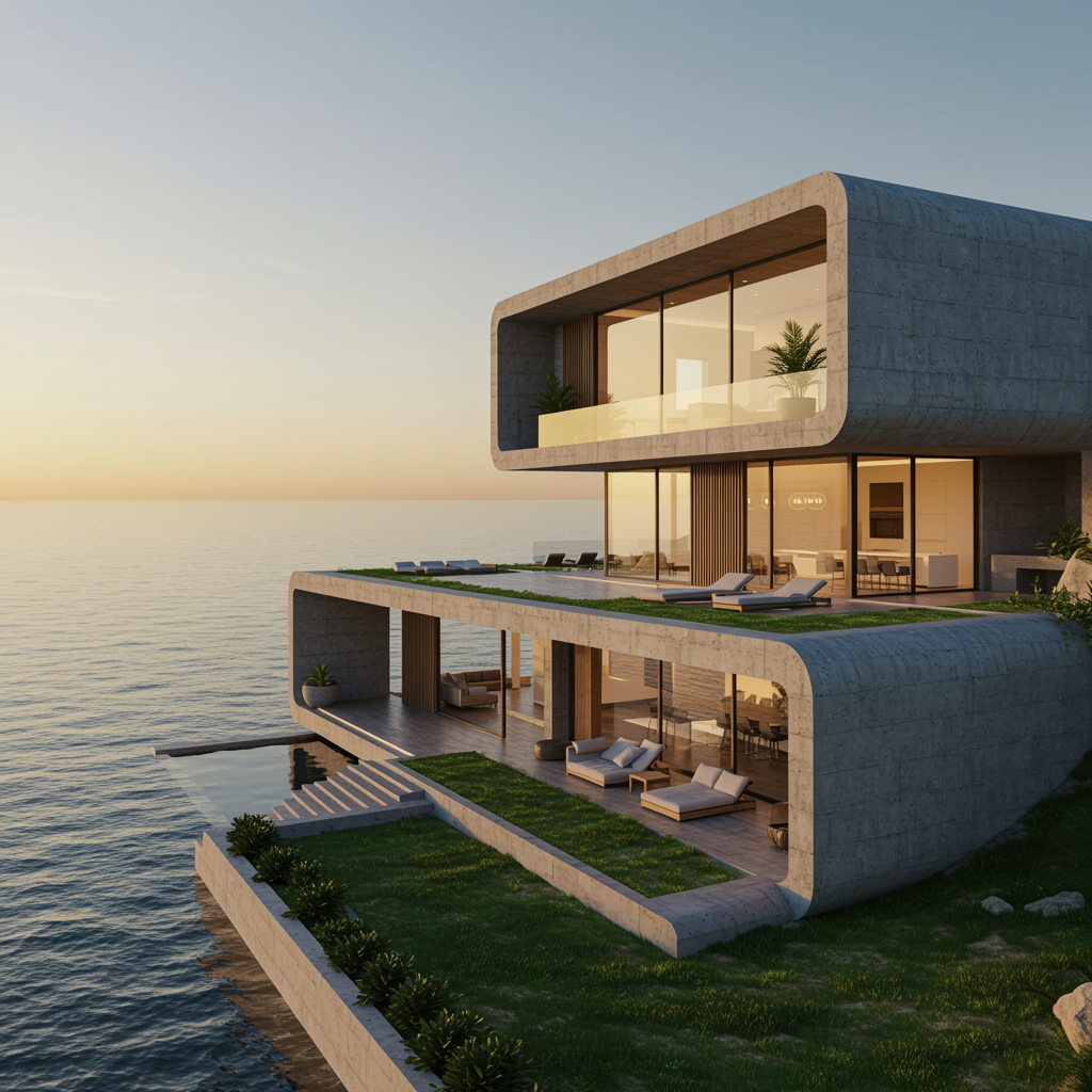 A stunning 8K hyper-realistic image of a breathtaking house featuring smooth concrete edges and expansive glass walls in a sleek 21st-century modern design. This architectural marvel is set against the serene backdrop of a vast, calm sea. During the golden hour, the house is bathed in warm, soft light, highlighting its elegant structure. Lush green terraces and minimalistic landscaping enhance its modern aesthetic, while a gentle sea breeze creates subtle ripples on the water, adding a sense of tranquility and harmony to the scene.