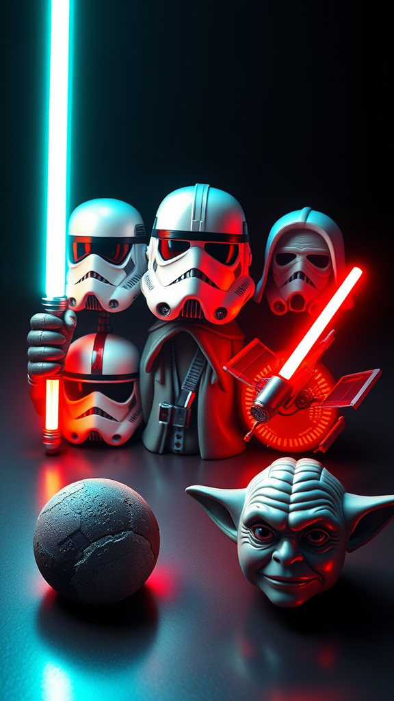 A stunning 8k octane render of a table layout showcasing eight unique, highly detailed emojis inspired by the Star Wars universe. Each emoji represents iconic elements: a lightsaber glowing with neon intensity, a detailed rendering of a droid's mechanical head with intricate circuits, a stormtrooper helmet with reflective surfaces, a starfighter engaging in a dynamic flight pose, a Jedi cloak with realistic fabric textures, a Sith holocron glowing ominously, a textured planet with atmospheric layers akin to Tatooine, and a Yoda-inspired wise and serene face. The scene captures a vibrant blend of realism and fantasy, with precise attention to light, shadow, and tiny details that evoke the epic saga's adventurous spirit.