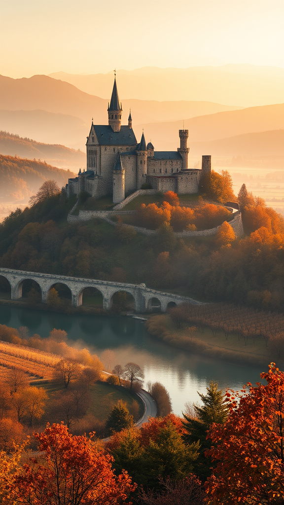 A stunning 8K professional concept art image captures a majestic medieval castle perched atop a hill, surrounded by sprawling vineyards. A serene river winds gently through the landscape, spanned by an ancient stone bridge. The scene is bathed in the warm glow of dawn, with autumnal colors painting the trees and foliage in rich reds and golds. Soft volumetric light filters through a gentle morning mist, adding an ethereal quality to the scene. The composition is ultra-detailed and highly realistic, reminiscent of a 35mm film aesthetic, making it a standout piece of art trending on ArtStation, with no visual distortions or imperfections.