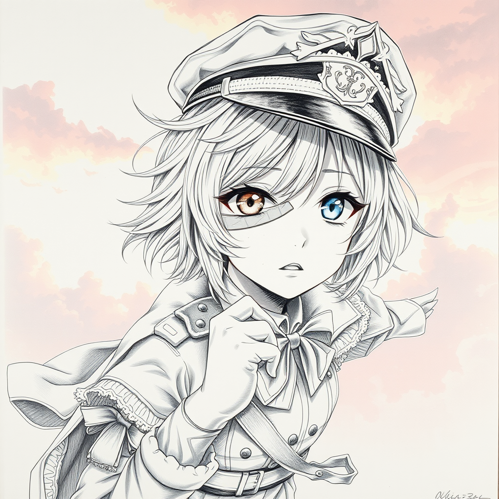 A stunning 8k wallpaper featuring a beautifully intricate pencil drawing set against a simple background. The artwork is black and white, showcasing clear lines on white paper, with a captivating character looking directly at the viewer. This official art is a masterpiece of ultra-detailed illustration, depicting a girl with disheveled hair, embodying game-inspired artwork perfect for a cover. The high-resolution, high-detail original piece features an exquisitely delicate and stunning face. The girl, surrounded by a colorful sky filled with clouds, appears to be flying at sunset, conveying a sense of sadness. One eye is covered by a bandage, with light particles surrounding her. She wears a cape and a military uniform complete with a hat, lace, ribbons, and stockings, suggesting a dynamic composition filled with motion. The scene is reminiscent of a battlefield, with the focus on incredibly detailed, expressive eyes. The solo figure is elegantly poised, with finely detailed elements like ray tracing, depth of field, detailed fingers, and white gloves, creating a breathtakingly beautiful and detailed piece of art.
