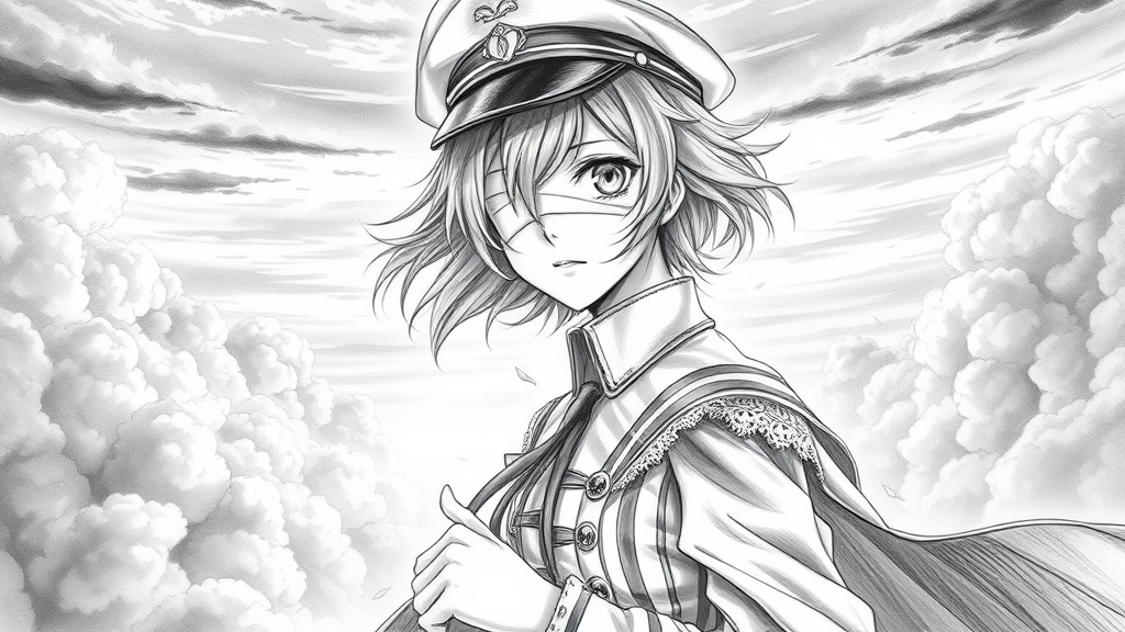 A stunning 8k wallpaper featuring an exquisitely detailed pencil drawing on white paper, showcasing a character with disheveled hair in a highly intricate and meticulous black and white style. This official art masterpiece boasts exceptional quality and ultra-detailed illustration. The female figure with a perfect face stands out against a simple background, looking directly at the viewer. Set in a dynamic composition amidst a dramatic cloud-filled sky at sunset, she appears to fly, evoking a sense of motion and grace. Her expression is tinged with sadness, accentuated by a bandage over one eye and soft light particles surrounding her. Dressed in a military uniform complete with a hat, cape, lace, ribbons, and stockings, she embodies a battlefield aura reminiscent of a game cover. Every detail from the beautifully rendered eyes to the finely detailed white-gloved fingers demonstrates the highest quality of art. The scene's depth is enhanced by ray tracing and depth of field, culminating in a breathtaking, incredibly detailed illustration.