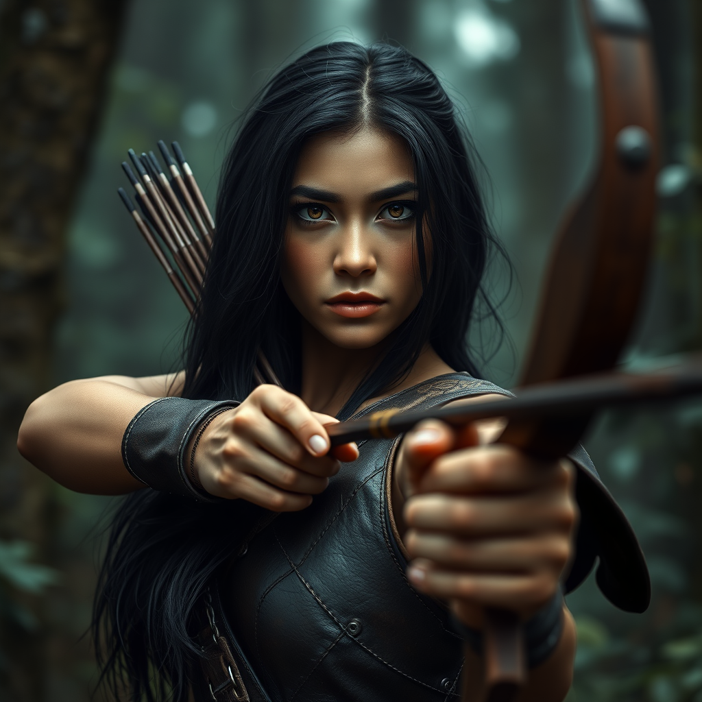 A stunning Amazon hunter stands poised in the heart of the forest, wielding a finely crafted bow and arrow. Her glossy, raven-black hair cascades down her back, accentuating her light, fair skin. Her enigmatic hazel brown eyes, framed by perfectly symmetrical and angelic features, gaze intently at the camera. The proportions of her face, body, limbs, and fingers are exquisitely balanced, each detail meticulously captured in the intricate, finely detailed leather armor that she wears. The armor and weapon showcase an elaborate design, set against the damp, overcast ambiance of the woods. The waist-length shot highlights her focused demeanor, captured with ultra-realistic clarity and cinematic style. The scene is depicted with breathtaking 8k quality, showing depth of field, authentic shadows, and subtle cinematic noise. Enhanced through advanced rtx ray tracing lighting and vfx post-production, the image resembles high-end movie quality or an octane rendering masterpiece, maintaining the essence of surreal realism within a 9:16 frame.
