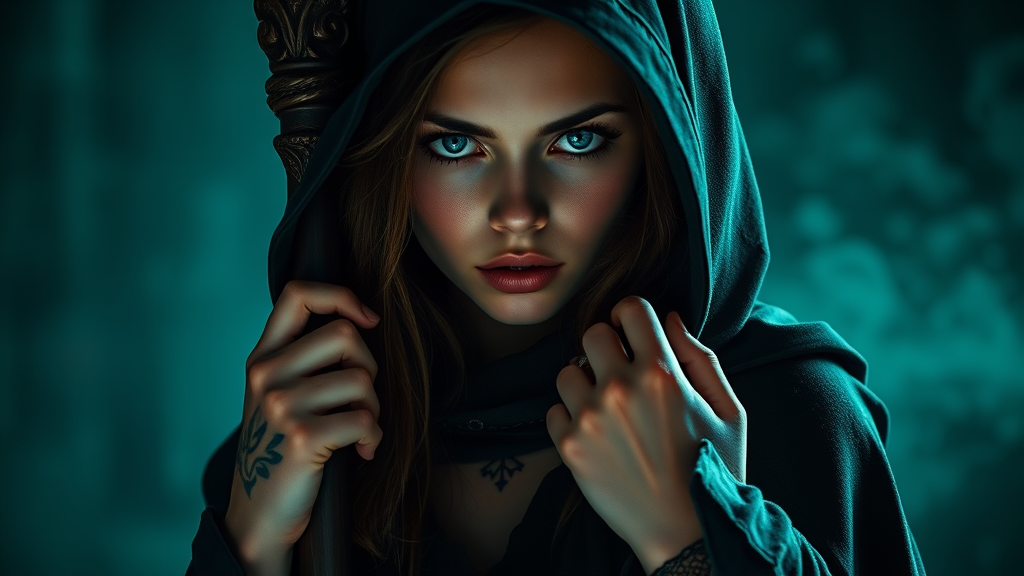 A stunning American girl in dark witch attire, complete with a long cloak and a sinister-looking staff, with deep blue eyes. Greenish lights cast eerie shadows, creating a spellbinding atmosphere. The scene captures detailed hands in photorealistic sharp focus, embodying a sense of enchantment and mystery. A tattoo peeks from beneath her cloak, adding an element of intrigue. Despite the dark theme, there is beauty in the details, with no abnormalities present, presenting a seamless composition that celebrates both the mystical and the natural.