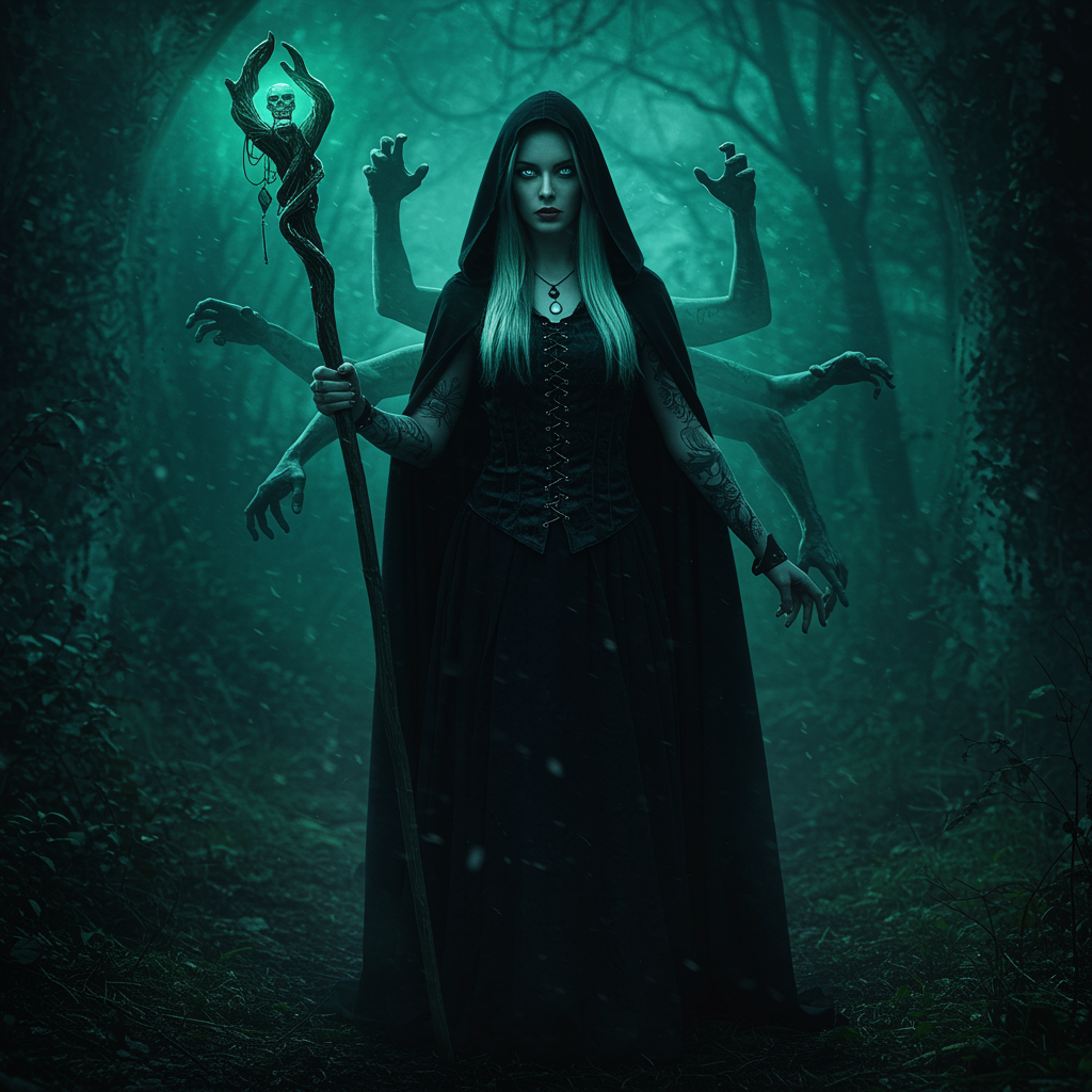 A stunning American woman dressed in dark, witch-like attire with a long, flowing cloak, holding a menacing staff. Her deep blue eyes contrast with the greenish glow and eerie shadows around her, creating a spellbinding atmosphere. The photorealistic scene is captured in sharp focus, showcasing intricate details, especially in her hands, and the play of light. Despite the enchanting setting, there are hints of surreal and disjointed elements, such as vague outlines suggesting extra or floating limbs, slight mutations, and an unexpected tattoo. The overall composition is a blend of beauty and the uncanny, with an intentional touch of haunting imperfection.