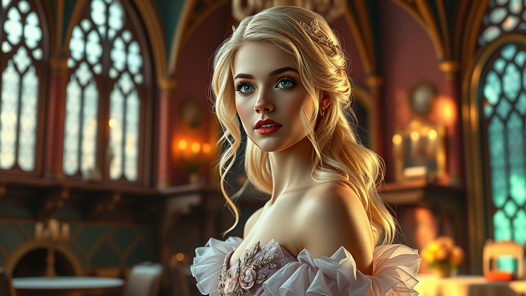 A stunning and aesthetic depiction of a vintage fairytale, featuring ultra-detailed art with intricate details. The scene is set in a spire room with cinematic lighting casting detailed shadows, showcasing a beautiful princess with a strikingly detailed face. She is a blonde, wearing an elegant indoor ballgown, captured in full body. The atmosphere is colorful and vibrant, reminiscent of UHD and HDR quality. The princess exudes grace and charm, embodying the essence of a fairytale in high definition.