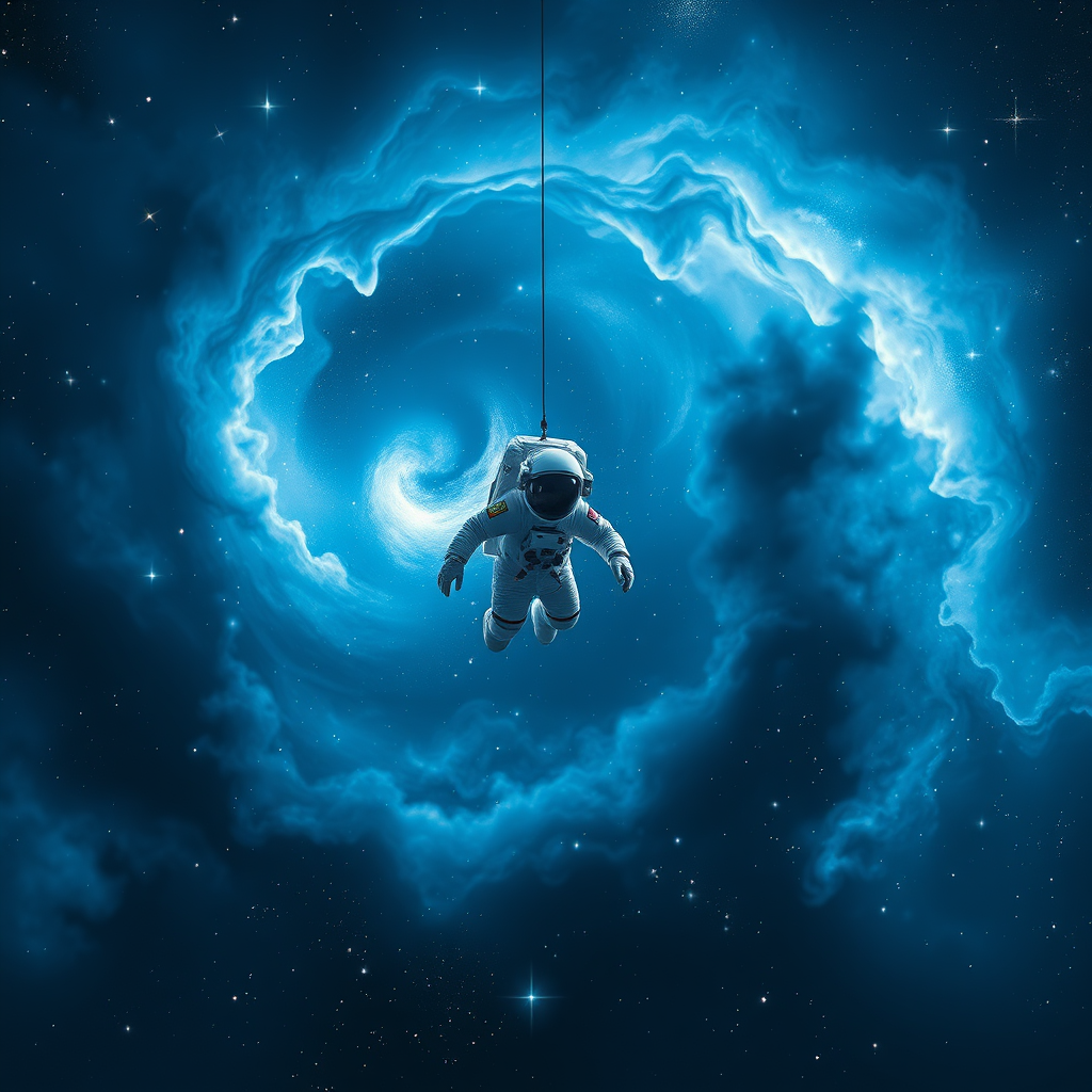 A stunning and captivating space-themed masterpiece showcasing the ethereal beauty of swirling nebulas and twinkling stars. It features an astronaut suspended in the vastness of space, enveloped in deep blue hues. The scene captures the awe of the cosmos with a touch of mystery, as some elements fade into a soft blur, enhancing the dreamlike atmosphere. This artwork echoes the infinite elegance of space, free from any distractions or obstructions, leaving only the pure essence of cosmic wonder.