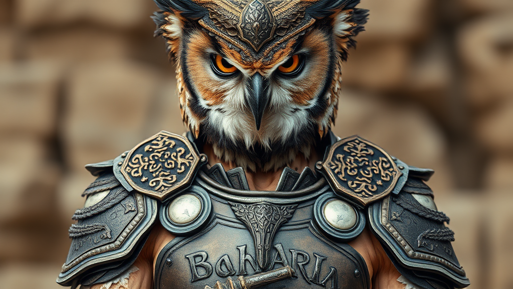 A stunning and detailed portrait photograph capturing an anthropomorphic hybrid of a human and an old owl warrior, showcasing perfect anatomy intertwined with wise, avian features. The subject exhibits the textured feathers of a venerable owl, seamlessly blending with human muscular structure. The owl warrior dons an intricately designed armor etched with ancient runes, symbolizing wisdom and strength. Captured with a Hasselblad H3DII, the portrait boasts extraordinary detail and depth of field, highlighting the subject's piercing, intelligent eyes that reflect an air of timeless wisdom. The background is softly blurred, adding to the depth and giving focus to the figure. The overall mood is upbeat, harmonizing the ancient and the contemporary, with small creative elements like feathered gauntlets and an elegant beak-inspired helmet adding to its uniqueness.