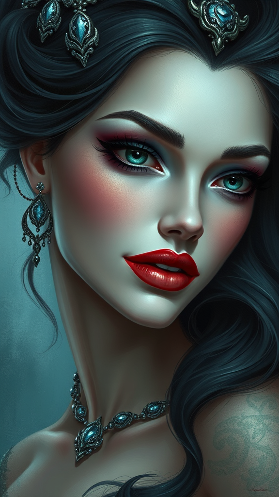 A stunning and elegant woman inspired by Ursula from Disney, exuding a mysterious allure and captivating beauty, painted with an Art Station style, enhanced with intricate details and a rich color palette, maintaining a balance between fantasy and realism, capturing the essence of enchantment and sophistication.