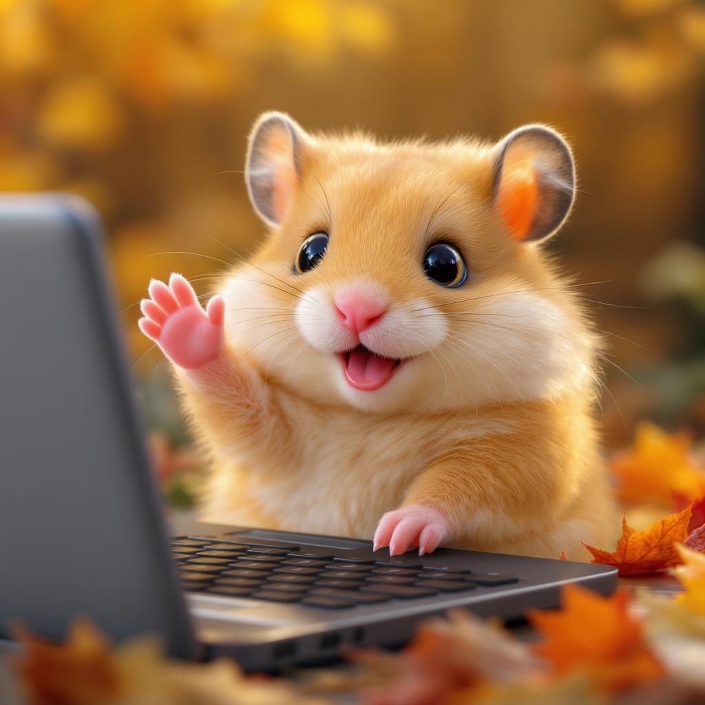 A stunning and enchanting portrait of an exceedingly cute and charming golden hamster, joyfully waving goodbye as it types out its whimsical blog post. The hamster's face is impeccably smooth and perfect, exuding an aura of fantasy and wonder, inspired by the character design brilliance of Mark Ryden, Pixar, and Hayao Miyazaki. The focus is razor-sharp, enveloping the scene in a cascade of harvest fall vibrancy, with intricate details that dazzle the eye. Cinematic lighting bathes the scene, enhancing its hyperrealistic quality, as if captured through a diorama macro lens in 8K and 4K resolution, creating a miniature world of lively imagination and heartwarming charm.