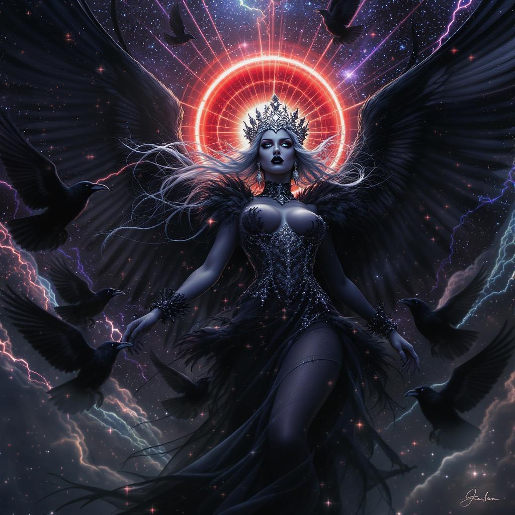 A stunning and enigmatic queen of ravens engaged in dynamic motion, exuding drama and allure as a seductive femme fatale. Her attire is adorned with elegant black plumes, and she commands the ravens with authority. Her black lipstick and icy blue-black hair create a striking contrast. Her eyes, a deep Pantone 2766, gaze with intensity reminiscent of a character in a World of Warcraft realm. A psychedelic backdrop hints at the birth canal, as she dons a gossamer silk dress, ethereal and light. Stars and galaxies serve as the dramatic background, and she wears an ornately designed, celestial crown. Captured from a low angle, god rays and radiant light add a divine quality to her presence. An iridescent red halo encircles her, while the detailed environment amplifies the macabre and dark fantasy atmosphere. In a style akin to Greg Rutkowski, the piece is an ultra-realistic, highly detailed, wide shot illustration. Photorealistic and sharply focused, it employs an octane render for a cinematic effect.