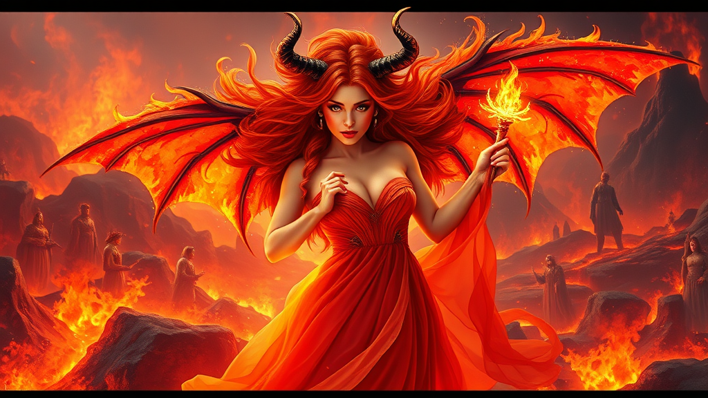 A stunning and ethereal female succubus with batwings and vibrant hair that resembles flames gracefully rises from a fiery landscape of magma and lava. Her lifelike, highly detailed face is captured in a perfectly centered composition. The scene is filled with magic and a dreamlike quality, enhanced by beautiful particle effects. The succubus wears a flowing, elegant gown that integrates seamlessly with her fiery, mythical surroundings. In one hand, she holds a mystical wand that glows with magical energy. The image showcases a rich palette of fiery colors and crisp, dramatic lighting, inspired by the styles of Artgerm, Greg Rutkowski, Alphonse Mucha, Loish, and WLOP. The setting is constructed in wide-angle, with a deeply detailed background that adds to the fantasy realm ambiance. This professional digital painting, suitable for trending art communities like Tumblr and ArtStation, achieves photorealism in 8k resolution. The composition includes a group of diverse characters in the background, adding depth and storytelling without detracting from the main figure. Elements of chaos like extra limbs or mutated features are hinted at artistically, blending seamlessly into the fantastical scene.