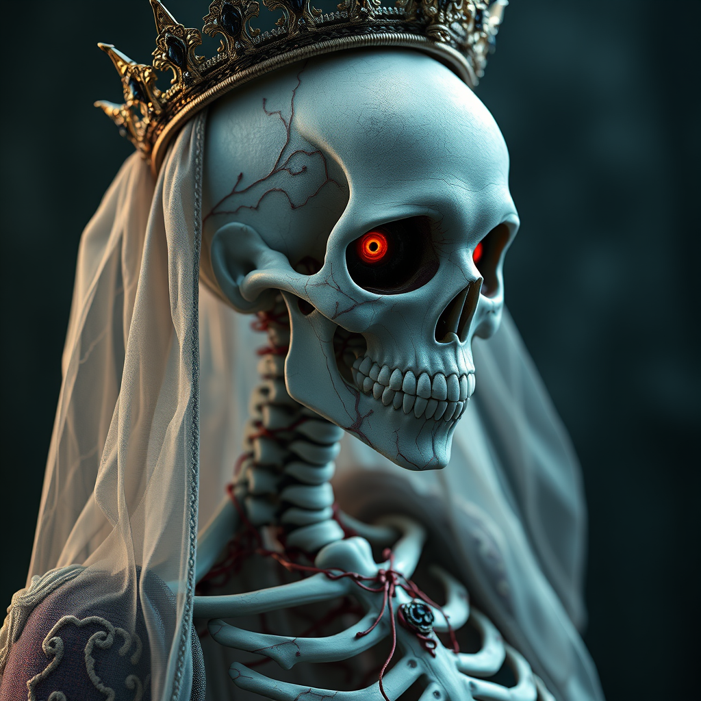 A stunning and ethereal skeletal woman adorned in regal queen's attire, reigning as the sovereign of the underworld. Her eye area is vividly colored, contrasted by her hollow eyes. Blood and veins intricately weave through her form, adding morbid elegance to her living-dead presence. This unholy queen exudes fantasy in an extremely intricate and hyper-realistic manner, presented in a cinematic style. A sideways pose captures her ghostly yet commanding presence, with detailed textures brought to life in 4k and 8k UHD using octane render. Her image evokes an otherworldly beauty amidst the macabre, with flawless anatomy and graceful limbs, maintaining a sense of eerie perfection.