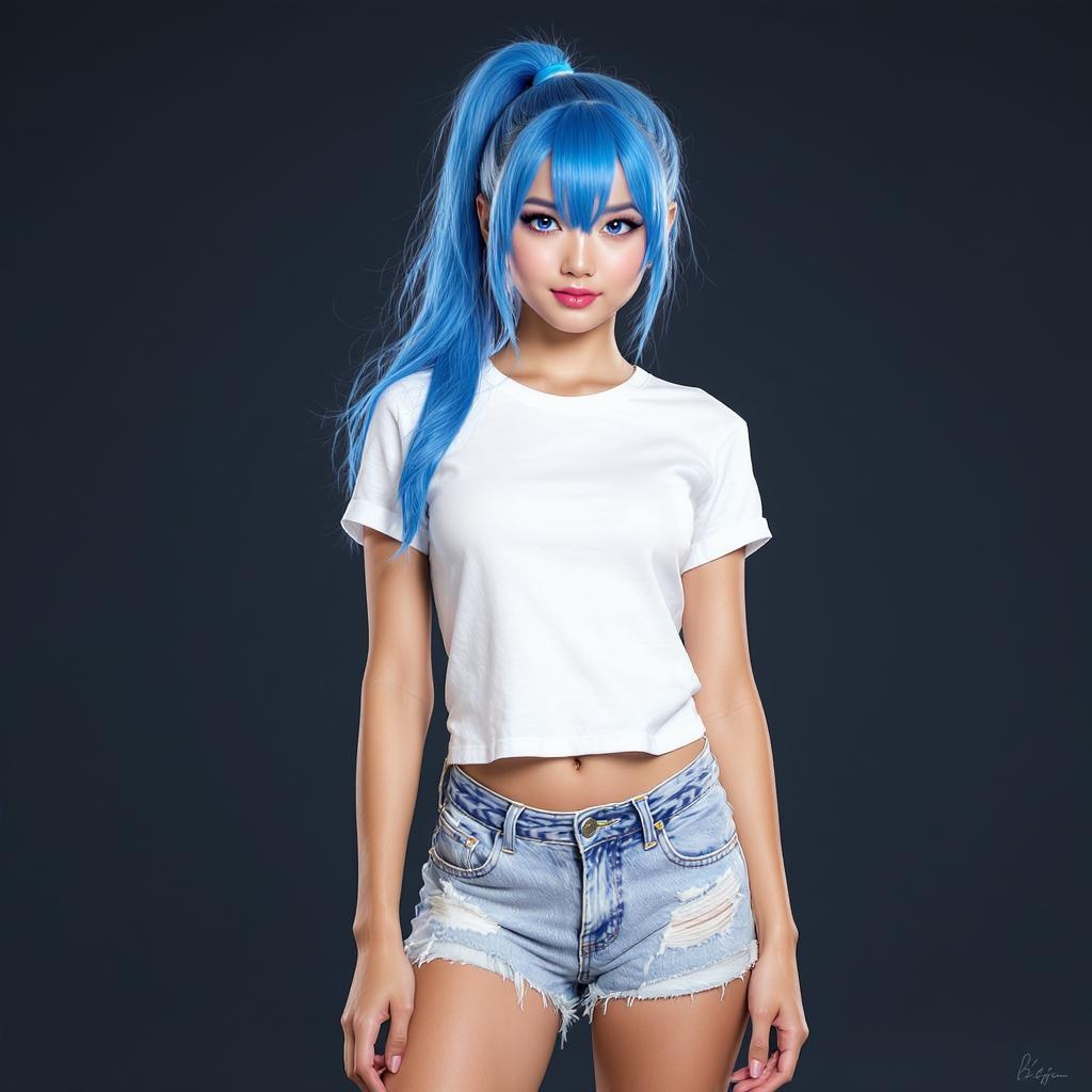 A stunning and high-quality image of a solo girl with captivating blue hair styled in a ponytail. Her eyes are a striking shade of blue, and she's dressed in a white T-shirt paired with shorts that complement the white and blue theme. She stands confidently in a cowboy shot pose, with medium-length hair and a visible navel, captured in sharp 8k, UHD, and HDR quality. Avoid any elements such as duplicates, mutations, or cloning. The scene is clear and devoid of any distortions like long necks, extra fingers, or mutated features. The background should be free of any low-resolution details, out-of-frame distractions, or artifacts like watermarks, logos, or text. The composition is seamless and fully focused on the subject without any split images or cartoonish aspects.