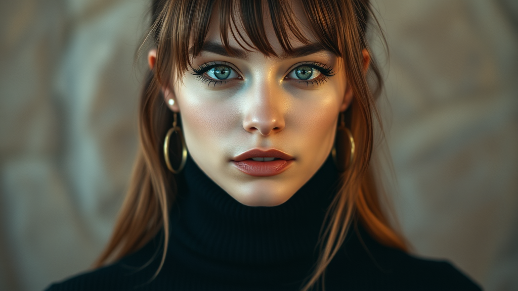A stunning and intricate full-color portrait of an attractive woman in a black turtleneck, featuring an epic character composition inspired by the styles of Ilya Kuvshinov, Alessio Albi, and Nina Masic. The portrait is captured in sharp focus and natural lighting, showcasing subtle subsurface scattering and a filmic quality with an f2 aperture using a 35mm lens. The artistic flair includes cartoon-like film grain, a touch of 3D depth, and a play with unusual colors and slight blurring for a dreamlike effect.