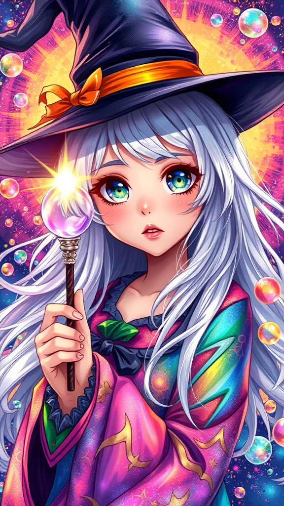 A stunning and intricate illustration of a captivating girl with a witch hat, holding a magical wand, her platinum hair flowing like liquid with multicolored streaks. Her eyes are vibrant and full of life, reflecting a kaleidoscope of colors. She is adorned in multicolored garments that shimmer in the sunlight, surrounded by an array of colorful bubbles and splashes. The background bursts with high saturation hues, evoking the magic of Halloween in an enchanting, whimsical scene.