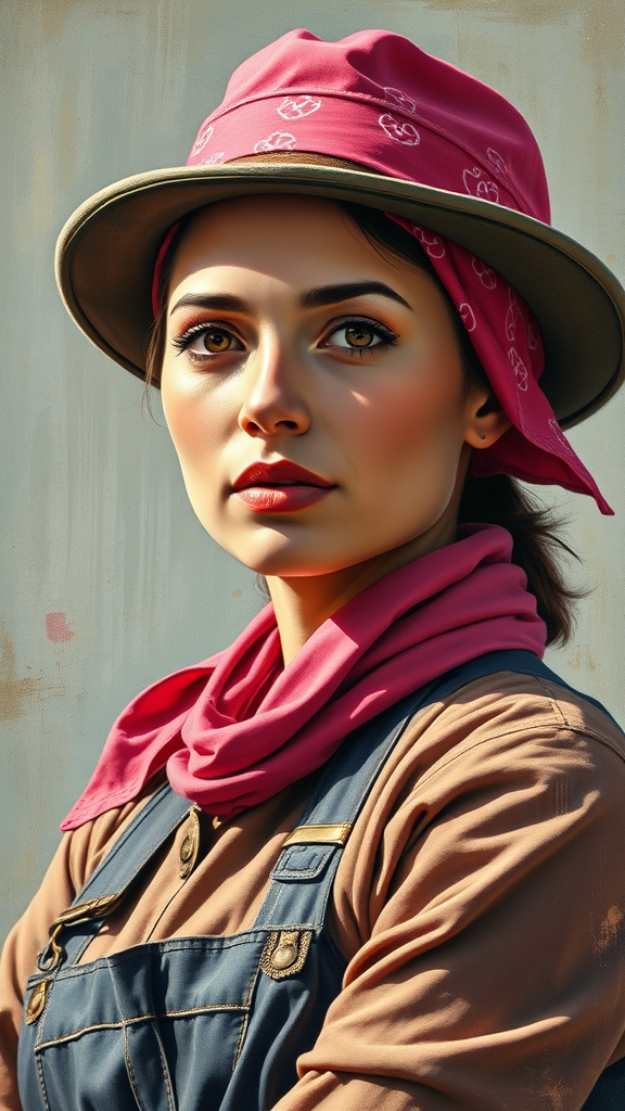 A stunning and intricate masterpiece of Socialist Realism depicting a woman wearing a vibrant pink bandana and a stylish hat, set against a backdrop reminiscent of Alexander Deyneka's Soviet painting style. The piece is created in the highest quality and resolution, featuring dynamic angles that amplify the sense of movement and energy. The lighting is crafted to infuse life into the scene, casting dramatic shadows and highlighting the woman's determined expression and graceful posture. Subtle creative enhancements, such as modern elements or abstract patterns woven into the background, provide a fresh twist while preserving the core concept of unity and strength. The overall composition celebrates the beauty of labor and resilience, with texture-rich brushstrokes that draw the viewer into a vivid tableau of courage and hope.