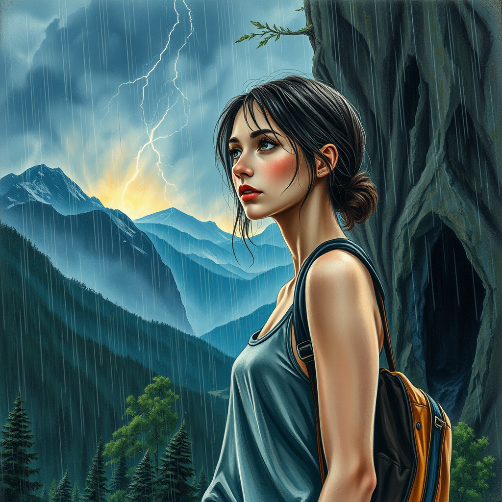 A stunning and intricate piece of art featuring a female traveler, depicted with beautiful colored pencil line art and elegant brush strokes. She wears a tank top that falls off one shoulder, embodying a sense of adventure as she stands amidst a breathtaking landscape of mountains, forests, and a dark, mysterious cave. Heavy rain pours down, with a watery sky illuminated by flashes of thunder, capturing an emotional intensity as raindrops trace her face. The composition is perfect, with incredible detail reminiscent of award-winning photography, as if photographed in 8k fine art quality. The scene is infused with realistic conceptual art, invoking the styles of Raphael, Caravaggio, Greg Rutkowski, Bepl Beksinski, and Giger. Bathed in soft light and shadows, the traveler appears in a masterpiece of oil on canvas, evoking the feel of natural volumetric cinematography and emotional music resonating through the atmosphere.