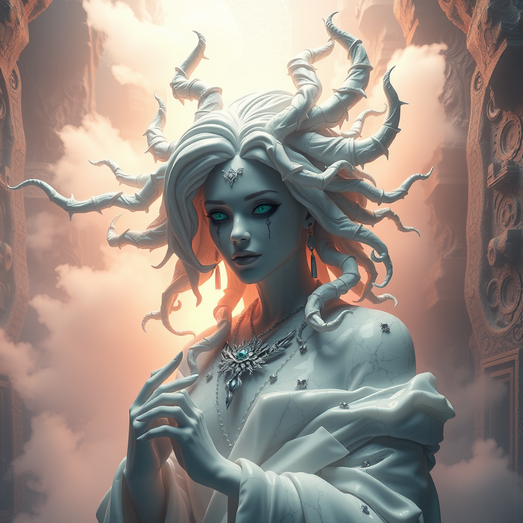 A stunning and intricate sculpture of a female necromancer crafted from marble and jade, surrounded by a mystical volumetric fog. The scene is imbued with hyper-realistic detail and cinematic lighting, showcasing a breathtaking, ultra-detailed environment reminiscent of a cybernetic realm. The artwork combines elements of hyperrealism and digital painting, with influences from CGI, anime, and illustration, captured using cutting-edge rendering engines for a wide-angle perspective. The image is sharp and flawless, avoiding any common visual artifacts, with perfectly proportioned and anatomically accurate features that emphasize beauty and mystique, all set within an enchanting digital landscape.