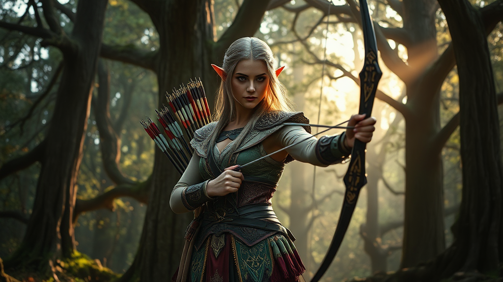 A stunning and intricately designed elf female archer standing gracefully in a mystical forest glade, embodying the spirit of an epic RPG character from dungeons & dragons; her attire is elaborately detailed, with ornate patterns and rich textures, quiver filled with meticulously crafted arrows. The scene is illuminated by dramatic, ethereal lighting, casting enchanting shadows amidst the towering ancient trees. Her expression is focused and intense, capturing the essence of hyperrealism and photorealistic detail. The cinematic quality of the scene is enhanced by an awe-inspiring 8k resolution. The composition is framed vertically to emphasize her elegant stature amidst the lush, vibrant surroundings.