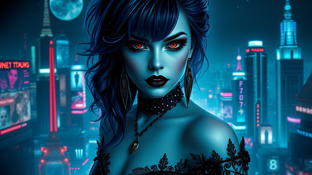 A stunning and sensuous woman with porcelain-white skin and striking dark blue hair stands as an alluring queen vampiress. Her crimson red eyes captivate with a mysterious charm, exuding a powerful, femme fatale presence amidst a dark, morbid, and gothic atmosphere. The scene is wet and dense with an epic, dramatic flair, rendering her figure as both hyperornate and incredibly detailed. She embodies glamour in a passionate, incredibly realistic manner, captured in a full-body shot with photorealistic detail and volumetric lighting. The backdrop is a behemoth city that seamlessly blends a vaporwave and psychedelic aesthetic, creating a vivid and imaginative landscape. Cinematic in scope, the setting is enhanced with CGI elements, offering maximum detail and an intense visual experience.