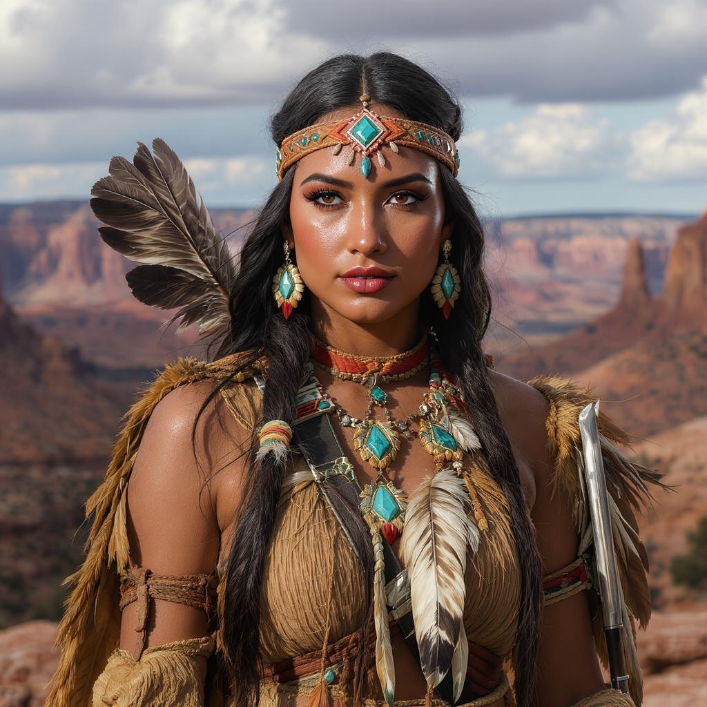 A stunning and ultra-realistic portrait of a young, beautiful Native American woman inspired by Madison Beer as Pocahontas, showcasing a perfectly symmetrical face adorned with intricate feather jewelry. She wears a traditional handmade dress, embodying the spirit of an armed female hunter-warrior. Set against the breathtaking Utah landscape, the scene captures an elegant and dynamic environment with rich depth of field. The style reflects the artistic influences of Artgerm, Greg Rutkowski, and Alphonse Mucha, rendered in incredible 8k detail, highlighting the blend of concept art elements with the essence of cultural heritage.
