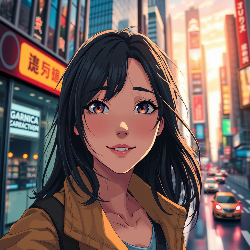 A stunning anime illustration captures an extreme closeup portrait of a beautiful woman navigating the bustling city streets, her eyes reflecting the vibrant lights and towering skyscrapers, gentle breeze playing with her hair, and a subtle smile hinting at her adventurous spirit.