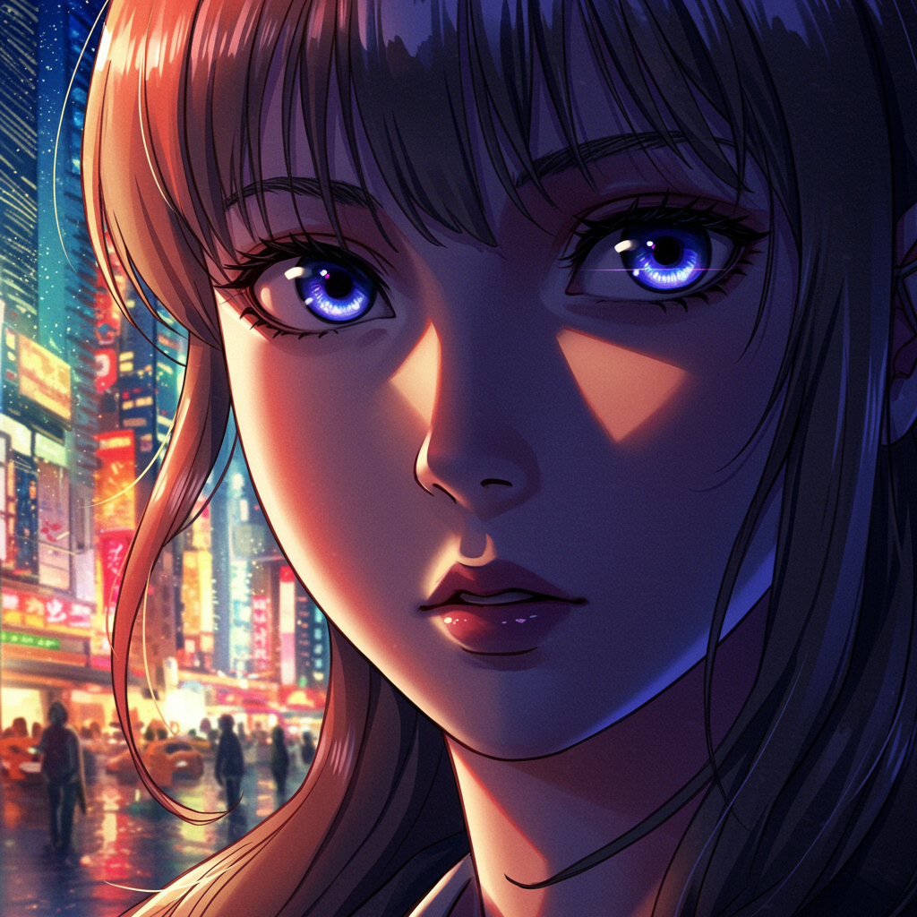 A stunning anime illustration depicting an extreme closeup portrait of a beautiful woman navigating the bustling city streets, her expression a mix of curiosity and determination, vibrant city lights reflecting in her eyes, contrasting with the soft shadows cast on her face by towering skyscrapers and urban life bustling all around her.