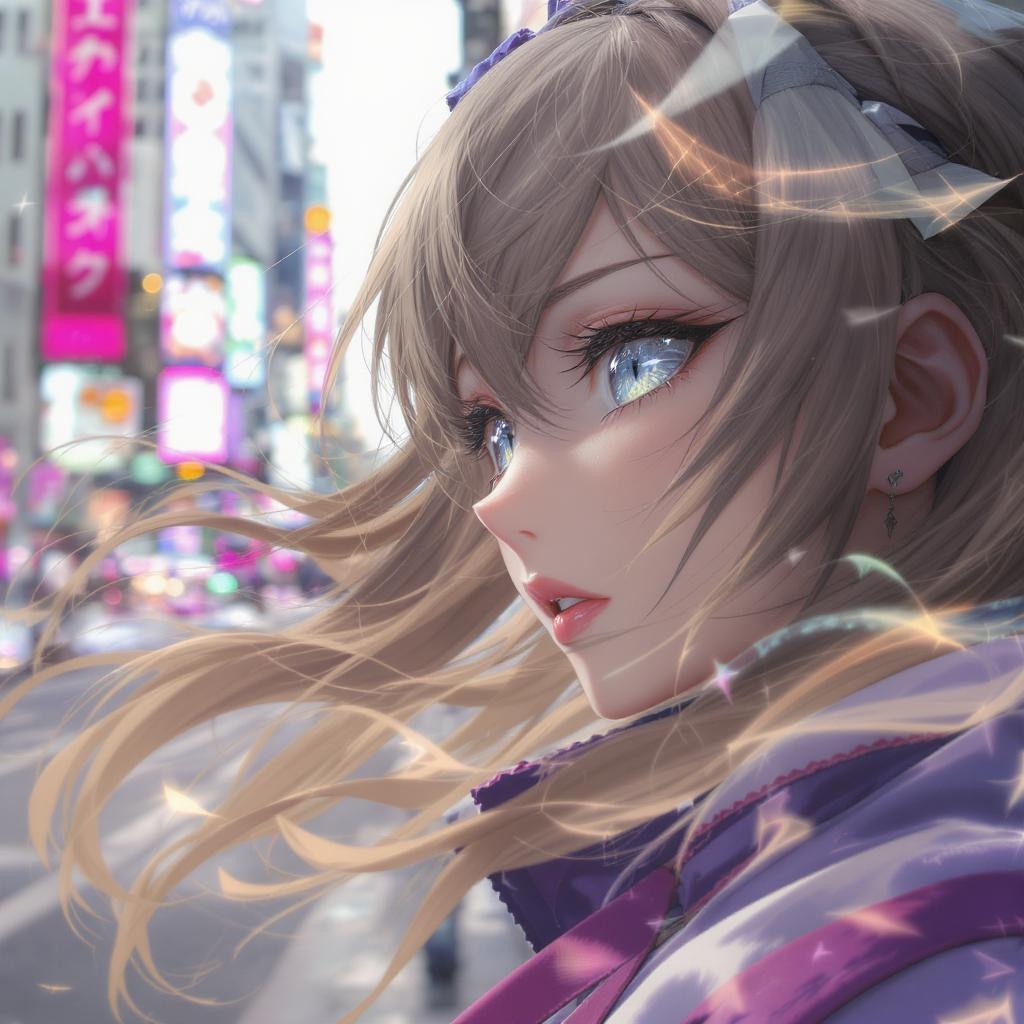 A stunning anime illustration depicts an extreme closeup portrait of a beautiful woman with intricate details, her face reflecting a soft glow as she moves gracefully through the bustling city streets, her expressive eyes capturing the vibrant energy of the urban landscape, delicate strands of hair flowing gently with her motion, while skyscrapers and colorful city lights blur in the background, adding a dynamic sense of motion and life to the scene.