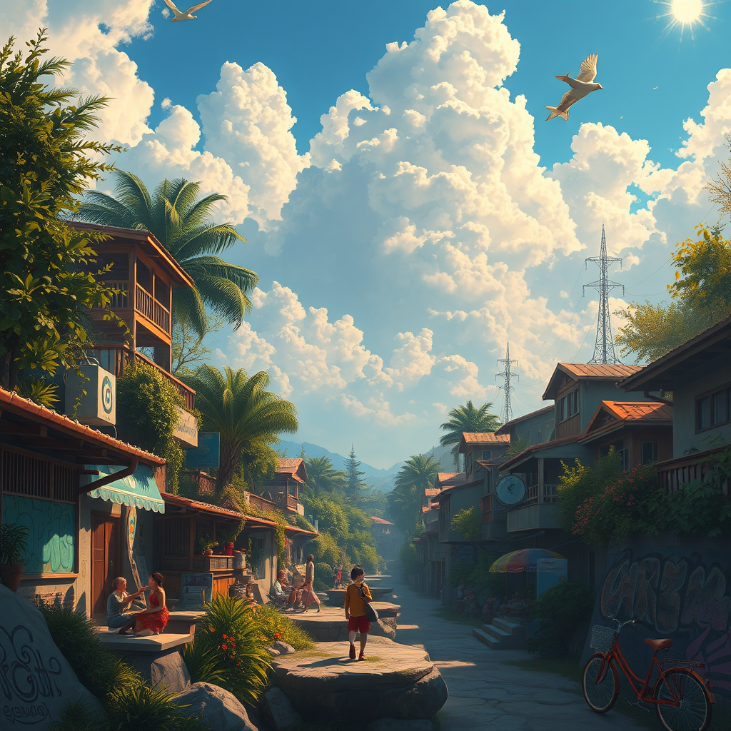 A stunning anime-inspired painting captures a serene solarpunk summer day, infused with the artistic essence of Tim Okamura, Victor Nizovtsev, Greg Rutkowski, and Noah Bradley. The piece, a trending masterpiece on ArtStation, boasts 8k resolution, exuding vibrant colors and intricate details. It effortlessly blends fine detail with graffiti artistry, embracing the golden ratio in its composition. The scene is lush with life, showcasing harmonious, interconnected communities surrounded by nature. The artwork, replete with beauty and imagination, presents a vision of a utopian future where technology and the environment coexist symbiotically, highlighting elements of human innovation and natural wonder.