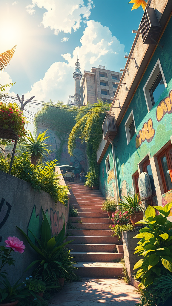 A stunning anime-inspired painting captures a solarpunk summer day, infused with the artistic styles of Tim Okamura, Victor Nizovtsev, Greg Rutkowski, and Noah Bradley. This masterpiece, trending on ArtStation, boasts a breathtaking 8k resolution filled with vibrant colors and intricate details. The scene features a harmonious blend of lush greenery and futuristic architecture, with walls adorned with lively graffiti art. Bathed in warm sunlight, the composition adheres to the golden ratio, creating a captivating and serene atmosphere. Delicate elements of nature intertwine with advanced technology, celebrating a utopian vision of life powered by renewable energy, enveloping viewers in a sense of wonder and tranquility.