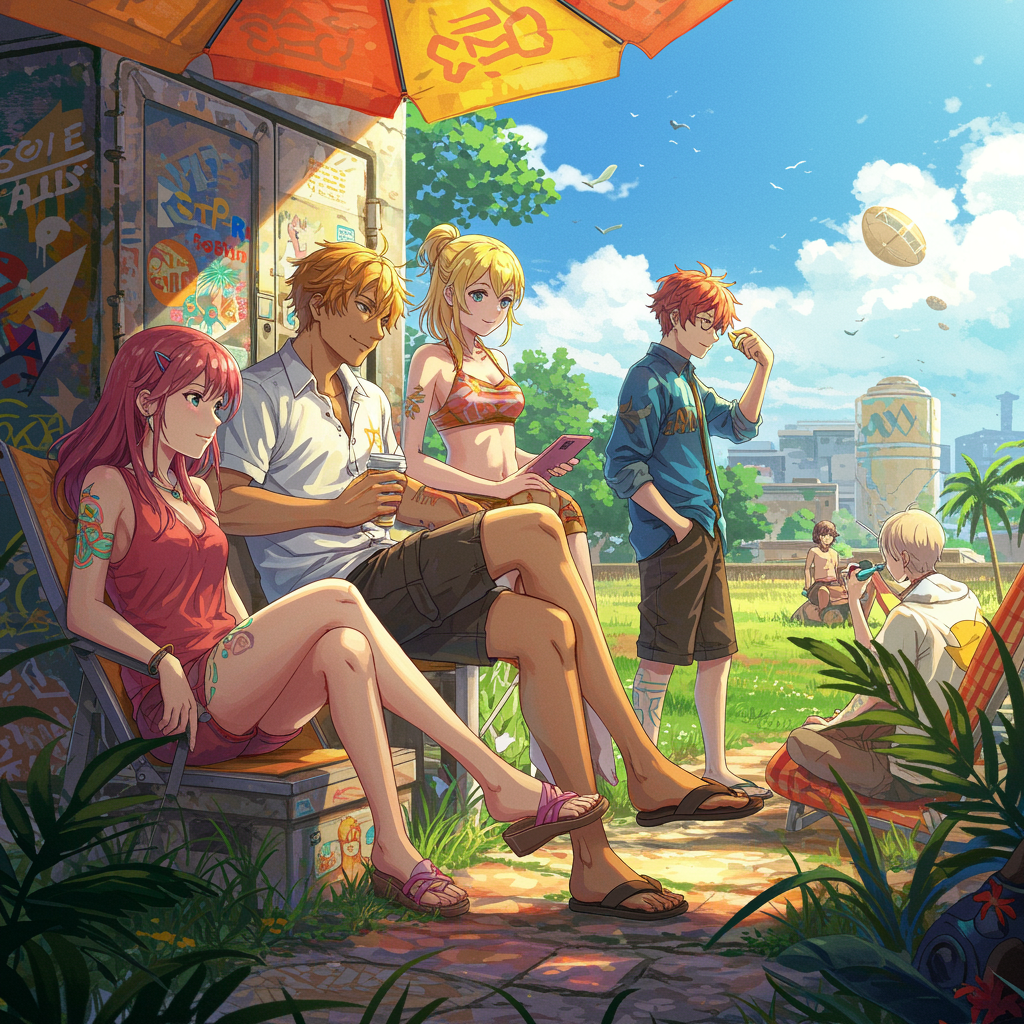 A stunning anime-inspired painting depicting a solarpunk summer day, filled with a sense of relaxation and vibrancy. Created in the artistic styles of Tim Okamura, Victor Nizovtsev, Greg Rutkowski, and Noah Bradley, this piece is trending on ArtStation for its 8K resolution and its status as a masterpiece. The artwork features graffiti paint with striking fine and intricate details, enriched with a full spectrum of colors. The composition follows the golden ratio, with a hint of abstract and surreal elements that add to its uniqueness. Characters are harmoniously integrated into the lush environment, with flawless anatomy and graceful poses. Every element is expertly rendered—hands and faces crafted with precision, all limbs perfectly connected, and a seamless flow that avoids any distortions or blurriness. The image has a balanced saturation, and there are no watermarks, ensuring an immersive and uncensored viewing experience.