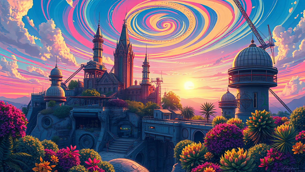 A stunning anime painting captures a serene solarpunk summer day, blending the vibrant styles of Tim Okamura, Victor Nizovtsev, Greg Rutkowski, and Noah Bradley. This masterpiece, trending on ArtStation, boasts an 8k resolution, vivid graffiti paint, and fine, intricate details. The scene is rich and full of color, embodying the harmony of technology and nature, with structures and landscapes arranged in perfect balance, reminiscent of the golden ratio. Beneath a sky of swirling hues, lush flora and futuristic elements coexist, creating a tranquil yet lively atmosphere. The composition invites viewers to explore its depth, revealing subtle narratives within its detailed brushstrokes.