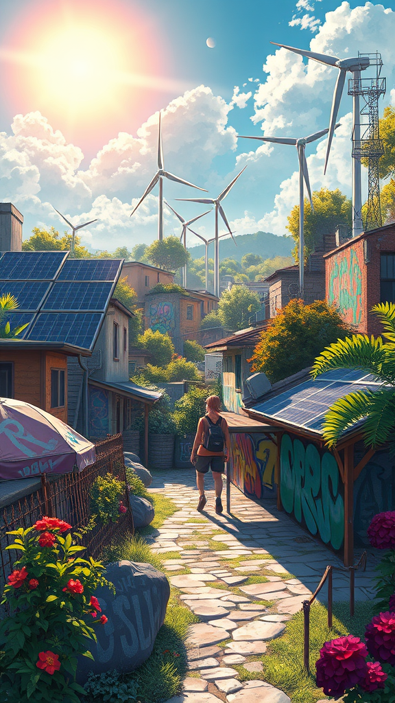 A stunning anime painting of a solarpunk summer day, capturing the tranquil ambiance and vibrant energy of a world in harmony with nature. Inspired by the styles of Tim Okamura, Victor Nizovtsev, Greg Rutkowski, and Noah Bradley, this piece is trending on ArtStation. Rendered in 8k, this masterpiece showcases graffiti-like strokes with fine detail, full of vivid colors and intricate detailing, embodying the essence of a golden ratio illustration. Urban elements seamlessly blend with lush greenery, solar panels glint under the brilliant sun, and wind turbines spin gently in the breeze, with colorful murals adorning the background, illustrating a future where sustainability and creativity flourish.