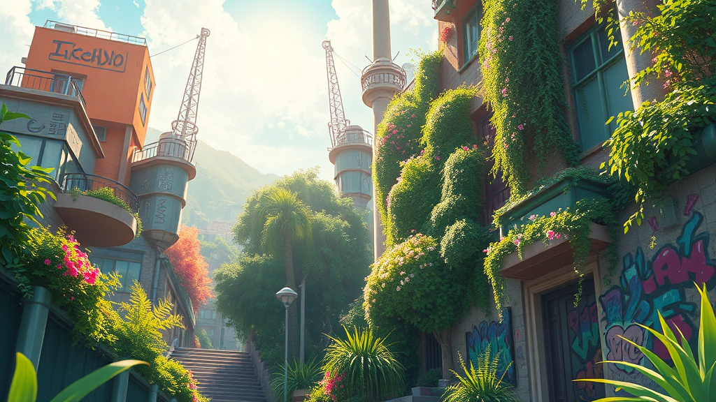 A stunning anime painting of a solarpunk summer day, capturing the essence of a serene, eco-friendly future. Influenced by the styles of Tim Okamura, Victor Nizovtsev, Greg Rutkowski, and Noah Bradley, this masterpiece boasts vibrant colors and intricate details. The scene, trending on ArtStation, is painted in 8k resolution, showcasing a harmonious blend of nature and technology. Lush greenery intertwines with futuristic architecture, embellished with graffiti-like artistry. Bathed in sunlight, the composition adheres to the golden ratio, offering a sense of balance and tranquility. The artwork invites viewers to immerse themselves in a world teeming with life and creativity, where nature and human innovation coexist beautifully.