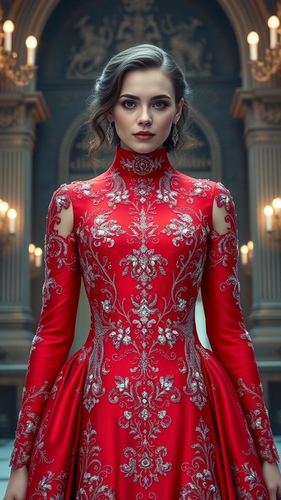 A stunning Anya Taylor-Joy is dazzling in a ruby red dress adorned with shimmering diamonds, featuring intricate brocade details. The gown, crafted from soft silk, highlights exquisite textures and design, suitable for a high-fashion display. Set in a sci-fi inspired Victorian great hall, the ambiance is enhanced by cinematic lighting that brings out the ultra-realistic, ethereal quality of the scene. Her gown, resembling a turtleneck bridal masterpiece, exudes elegance in wedding photography style, capturing her beauty in a full-body, symmetrical pose. The creation resonates with the artistic flair of Peter Mohrbacher, presented in an octane render that further elevates its visual allure.
