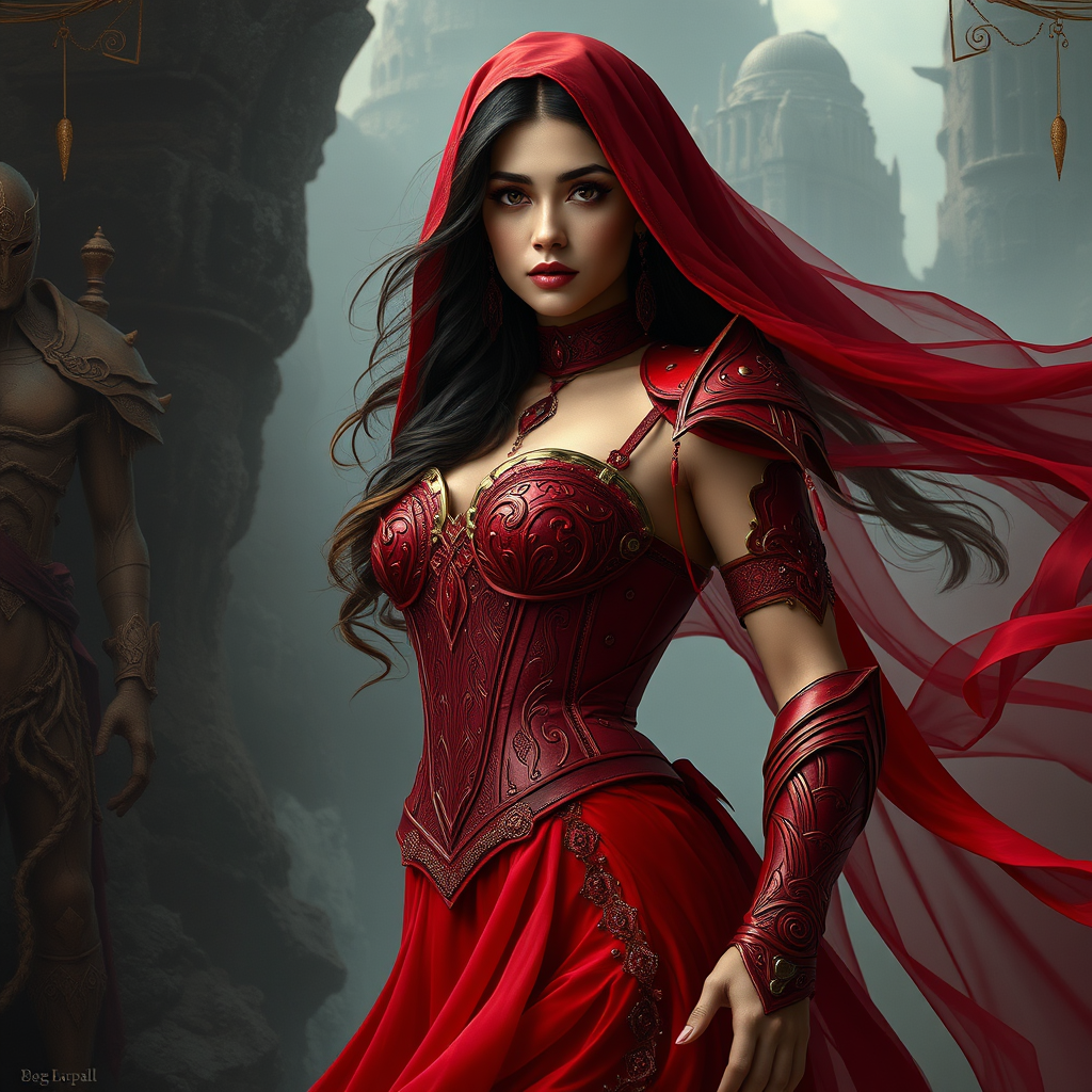 A stunning Arab woman adorned in an intricately designed red corset and flowing red dress, crafted in the style of Karol Bak, Alena Aenami, and Artgerm. This hyperrealistic fantasy artwork captures her elegance and strength, featuring 8k high-quality detail and a fusion of realism with fantasy. Her presence is both ethereal and captivating, reminiscent of a warrior goddess, with red armor accents and a majestic aura. Influences of Julie Bell and Beeple enrich the piece, emphasizing her beauty and the striking contrast of her crimson attire against an otherworldly backdrop.