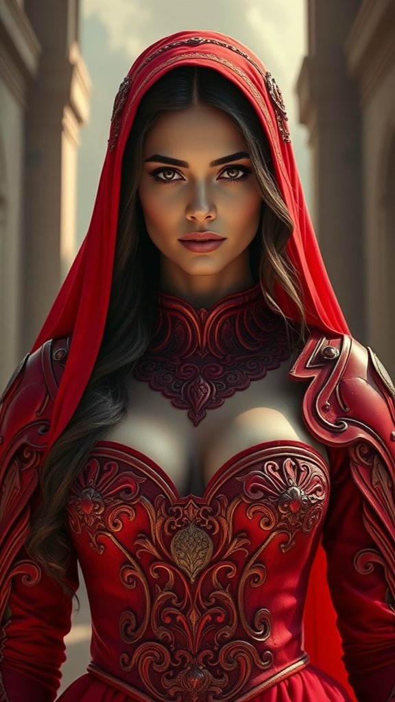 A stunning Arab woman wearing a crimson corset and flowing red gown stands poised, blending the sensuous styles of Karol Bak with the ethereal touches of Alena Aenami and Artgerm. Her visage combines hyperrealistic fantasy art with 4k and 8k high-quality details, embodying a captivating presence. Adorned in intricate red armor that echoes the allure of Julie Bell’s and Beeple's creations, she exudes elegance and power. Her gaze is both mystical and captivating, enveloping her in an aura of beauty and strength, a masterpiece of realistic fantasy art.